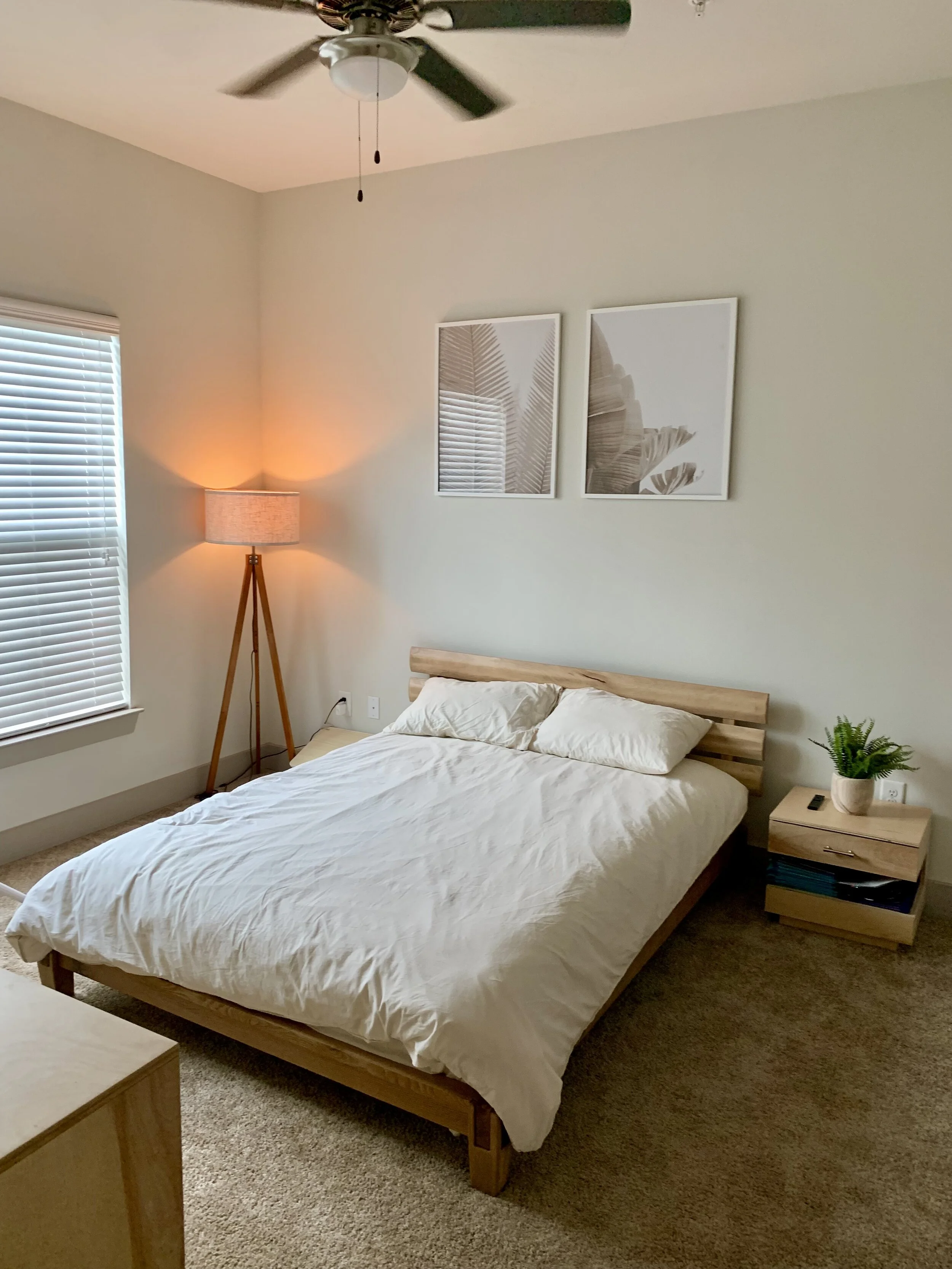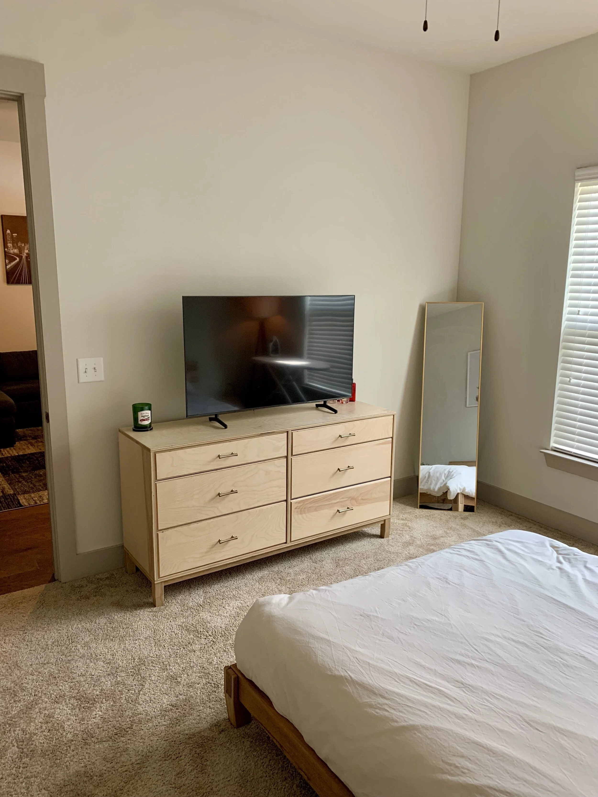 Calming and Scandinavian. What this bedroom suite lacks in embellishment, it excels in a sleek and relaxing style. The Bed frame is made of solid white oak and the headboard is maple. The frame is a knock down design that only needs 2 metal fasteners to make moving easy. The night stand and dresser are all high quality VOC and Formaldehyde free plywood with soft close sliders.