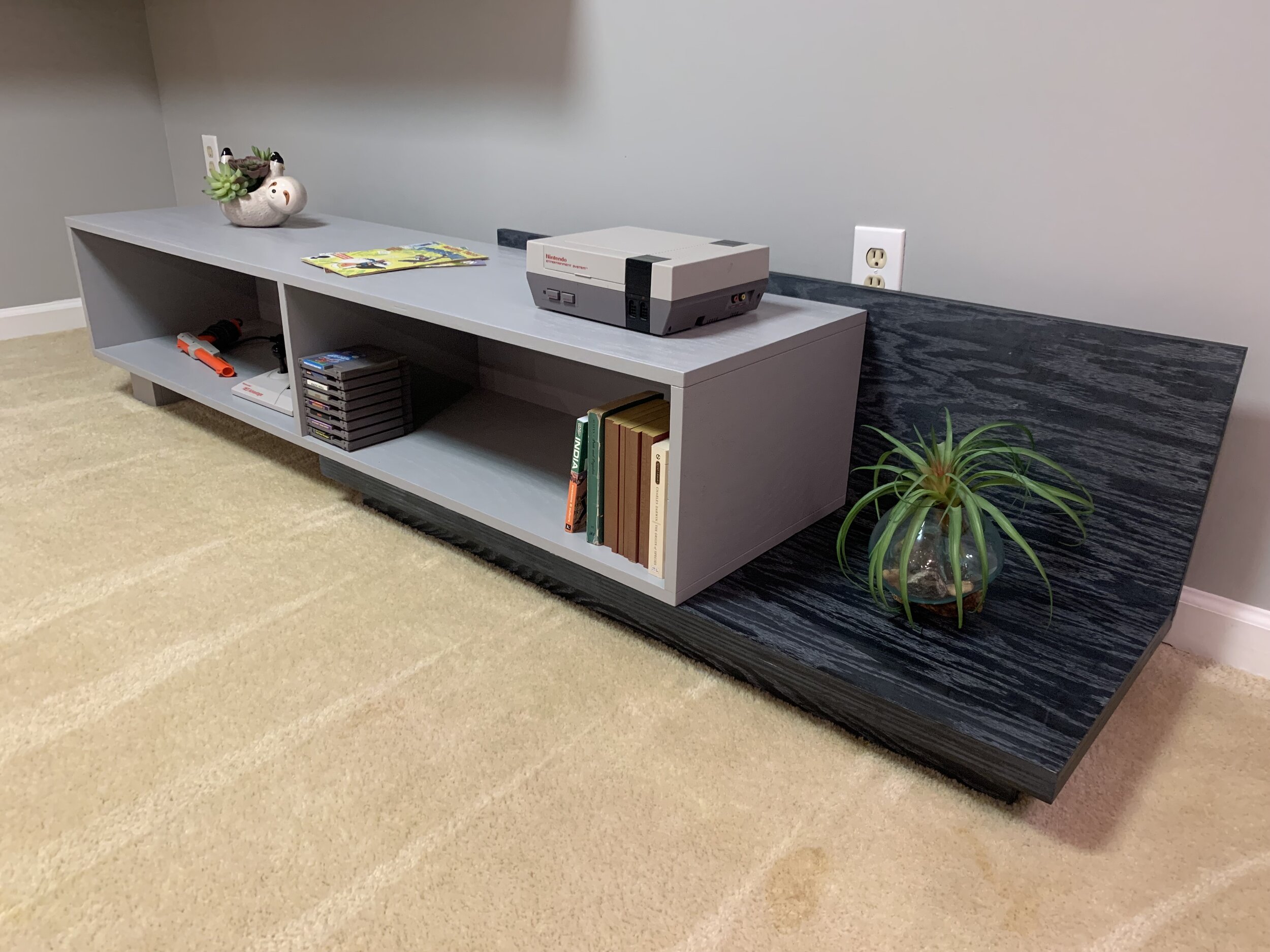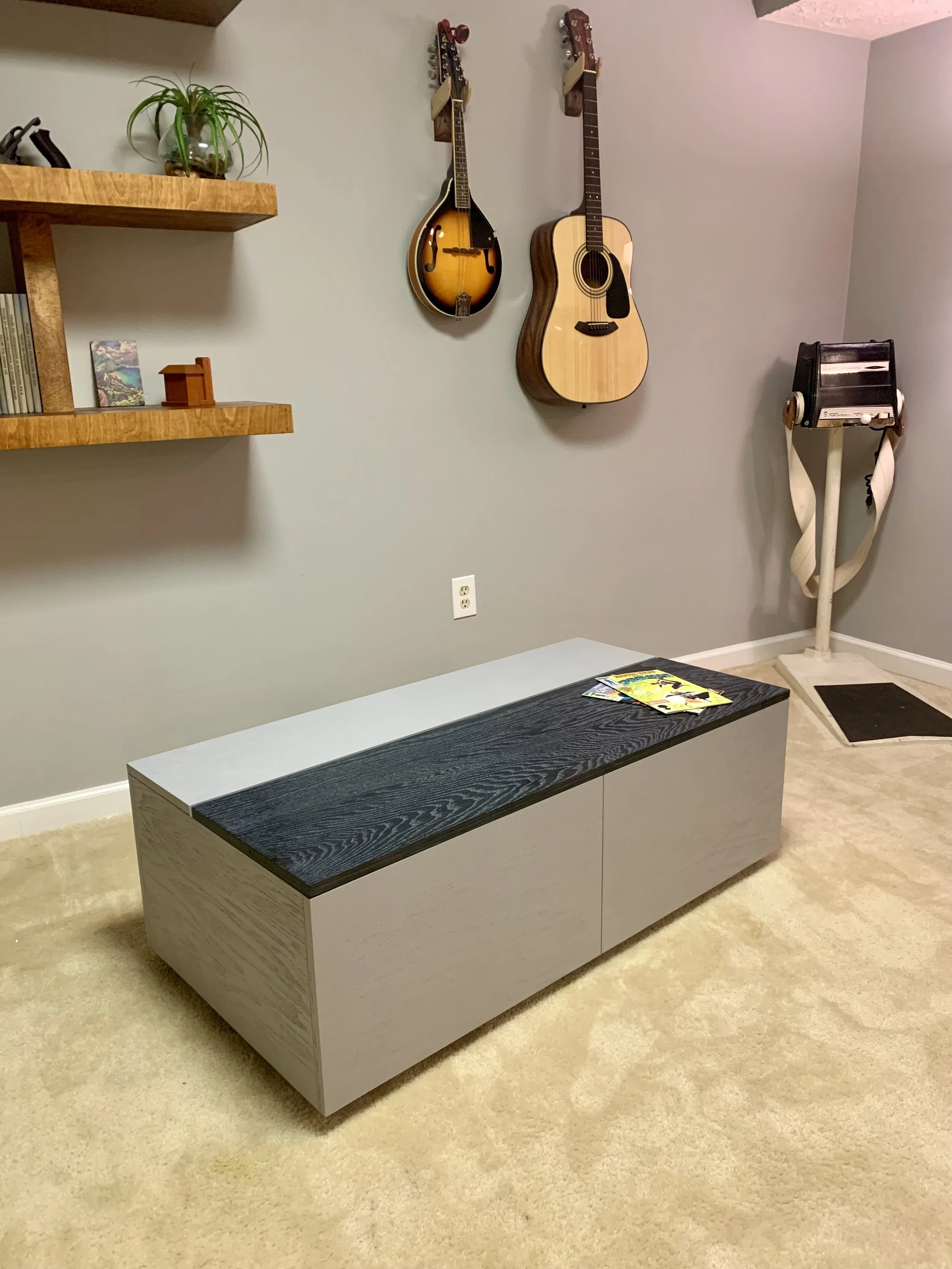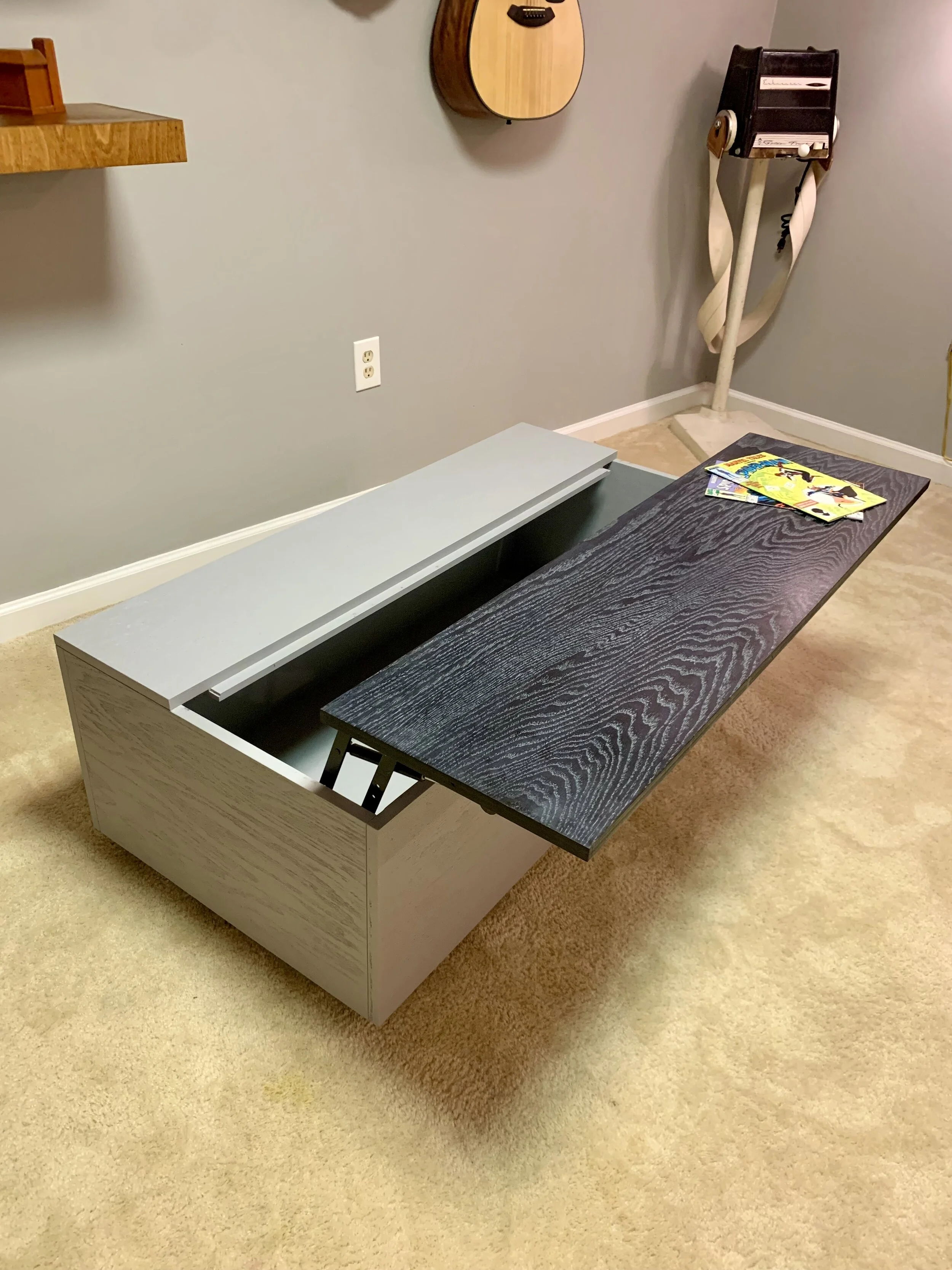 Sleek, smooth and modern. This matching coffee table and credenza set has a few surprises up their sleeves. The coffee table has a lift-top mechanism built in to get that beloved popcorn bowl within arms reach. The credenza is 2 pieces and has the unique ability to grow and shrink to accommodate any space.