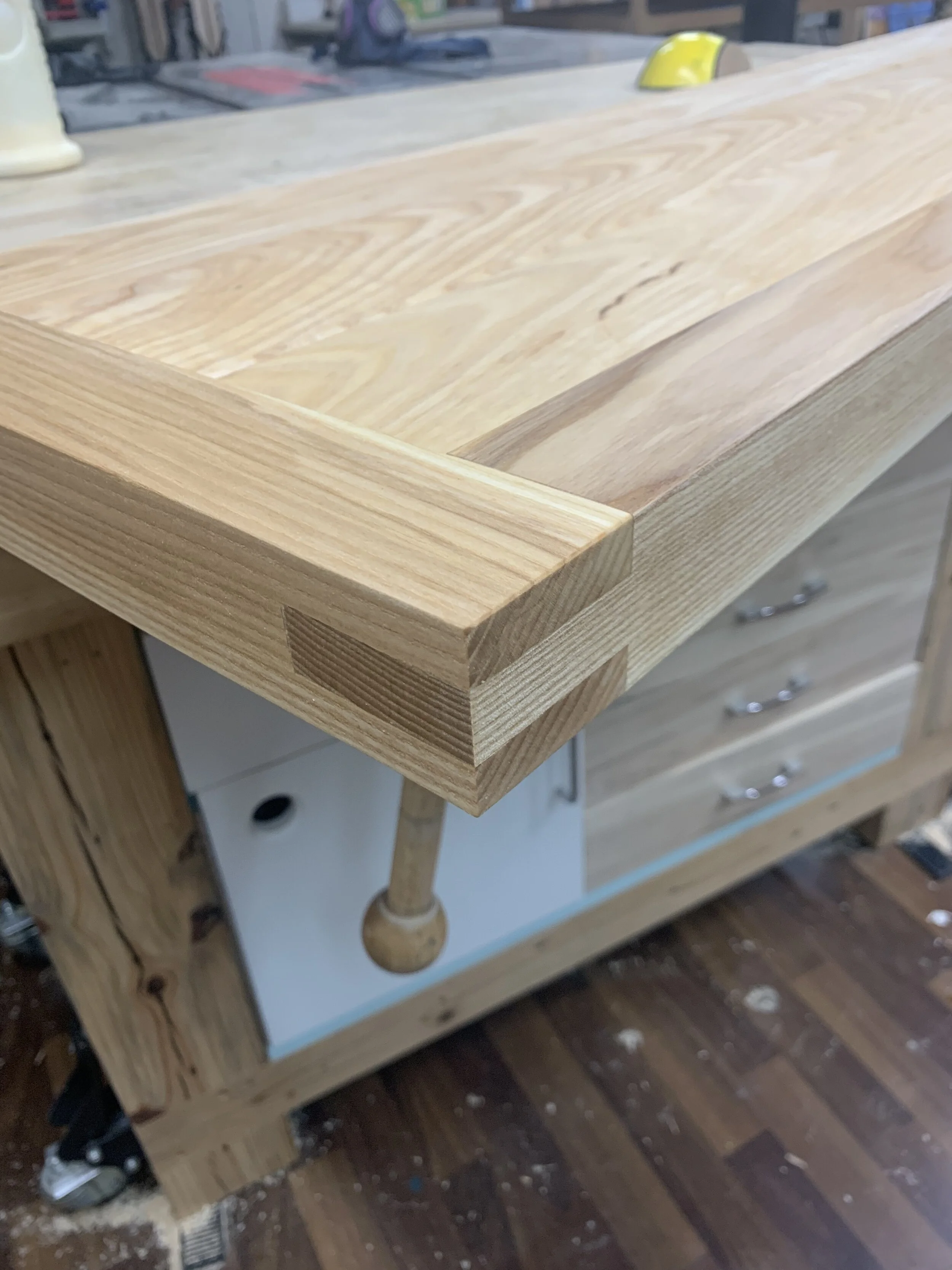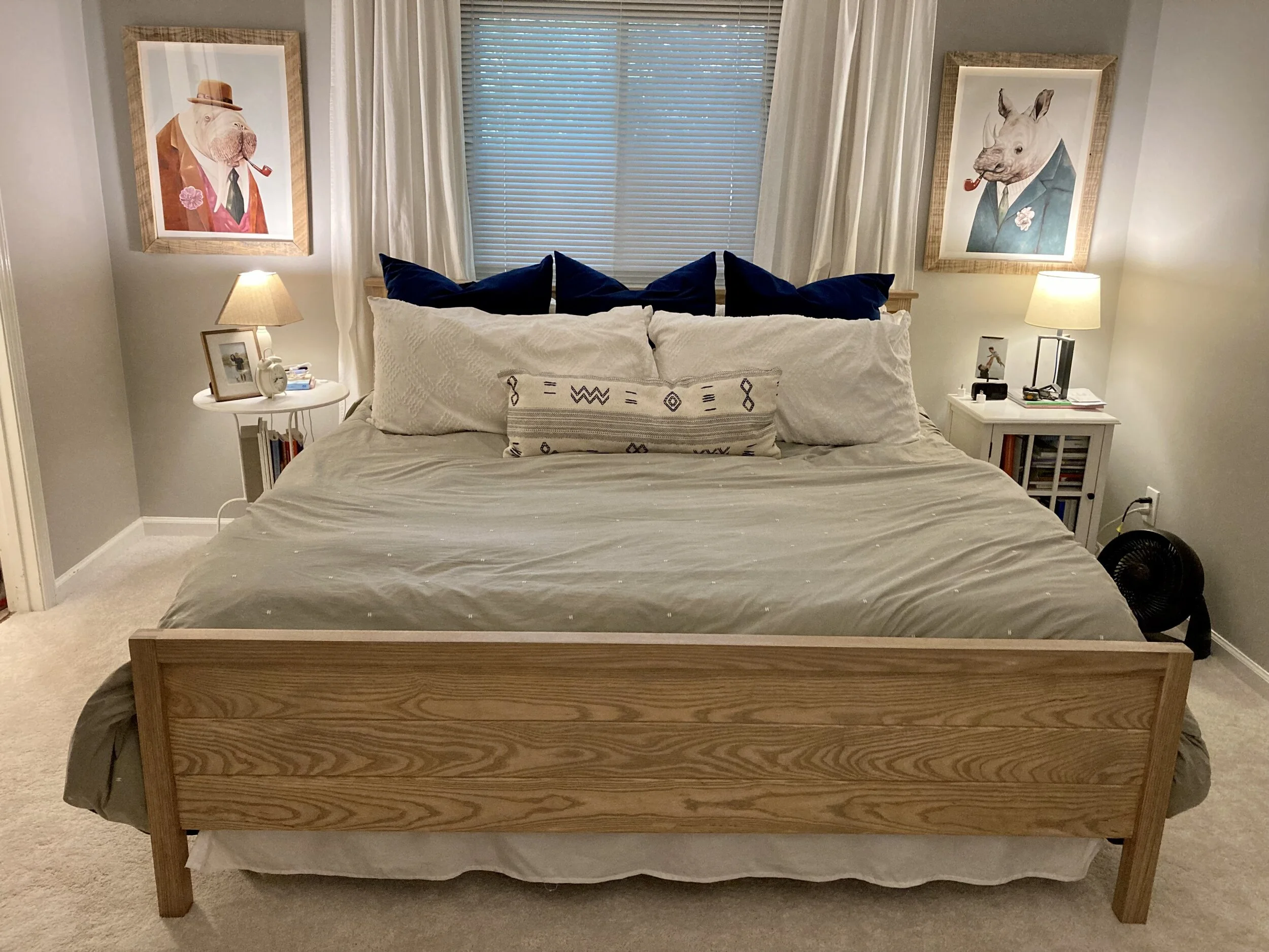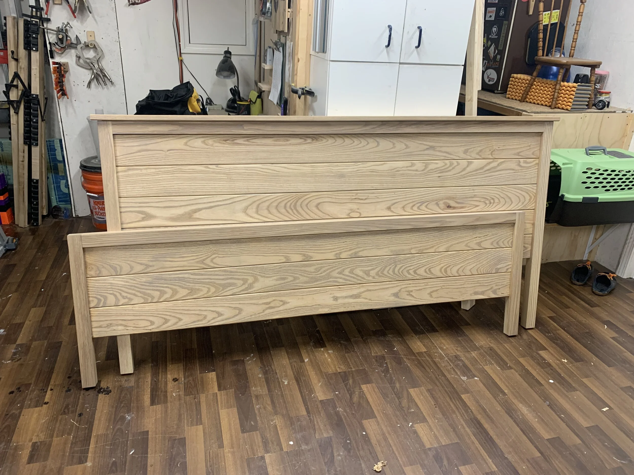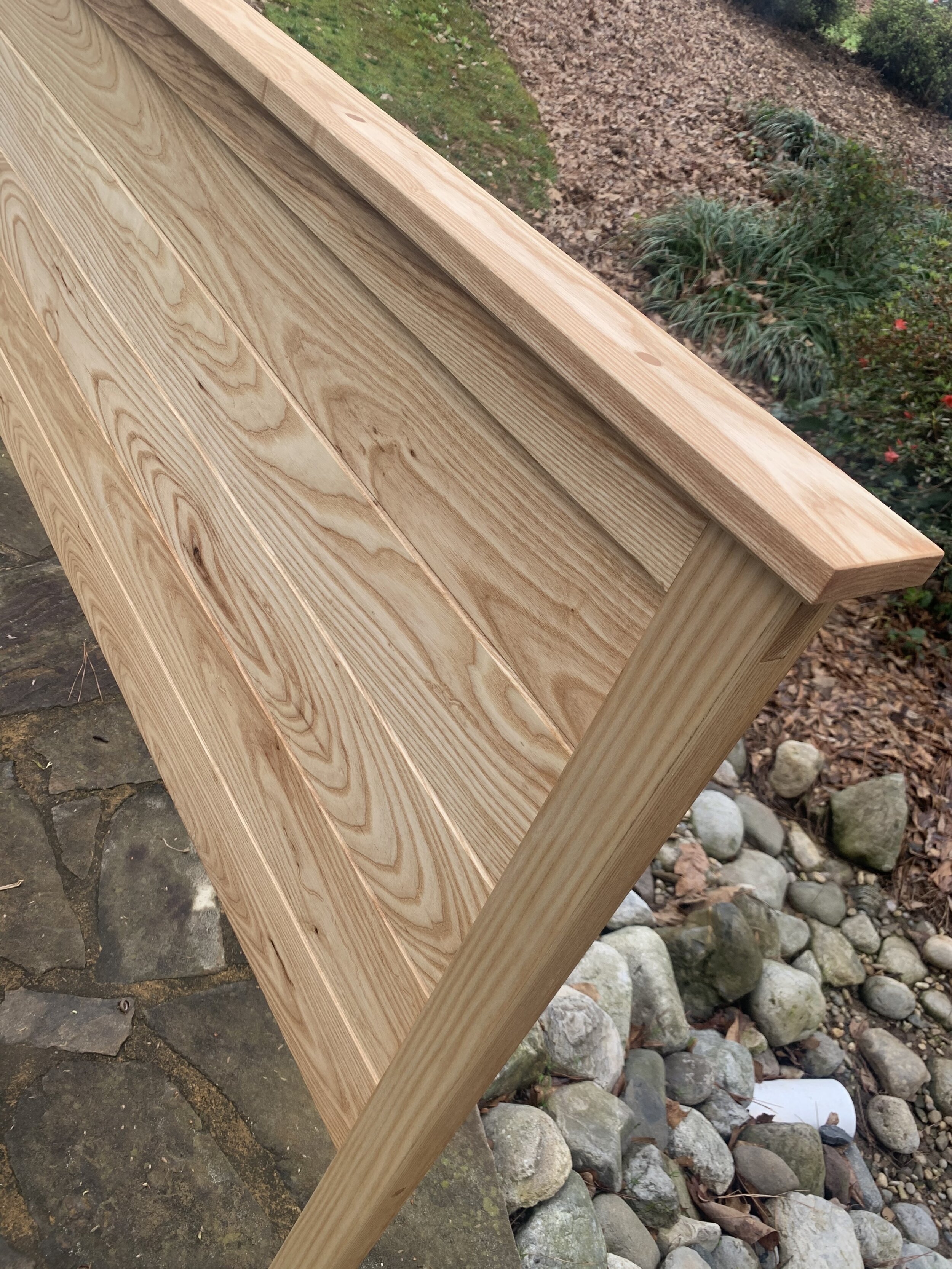This clean solid ash bed was made with some robust bridal joints for the frames and the reinforced with thru dowels along the top rail. Everything was sanded ultra smooth and finished with Rubio Monocoat for a safe and healthy finish.