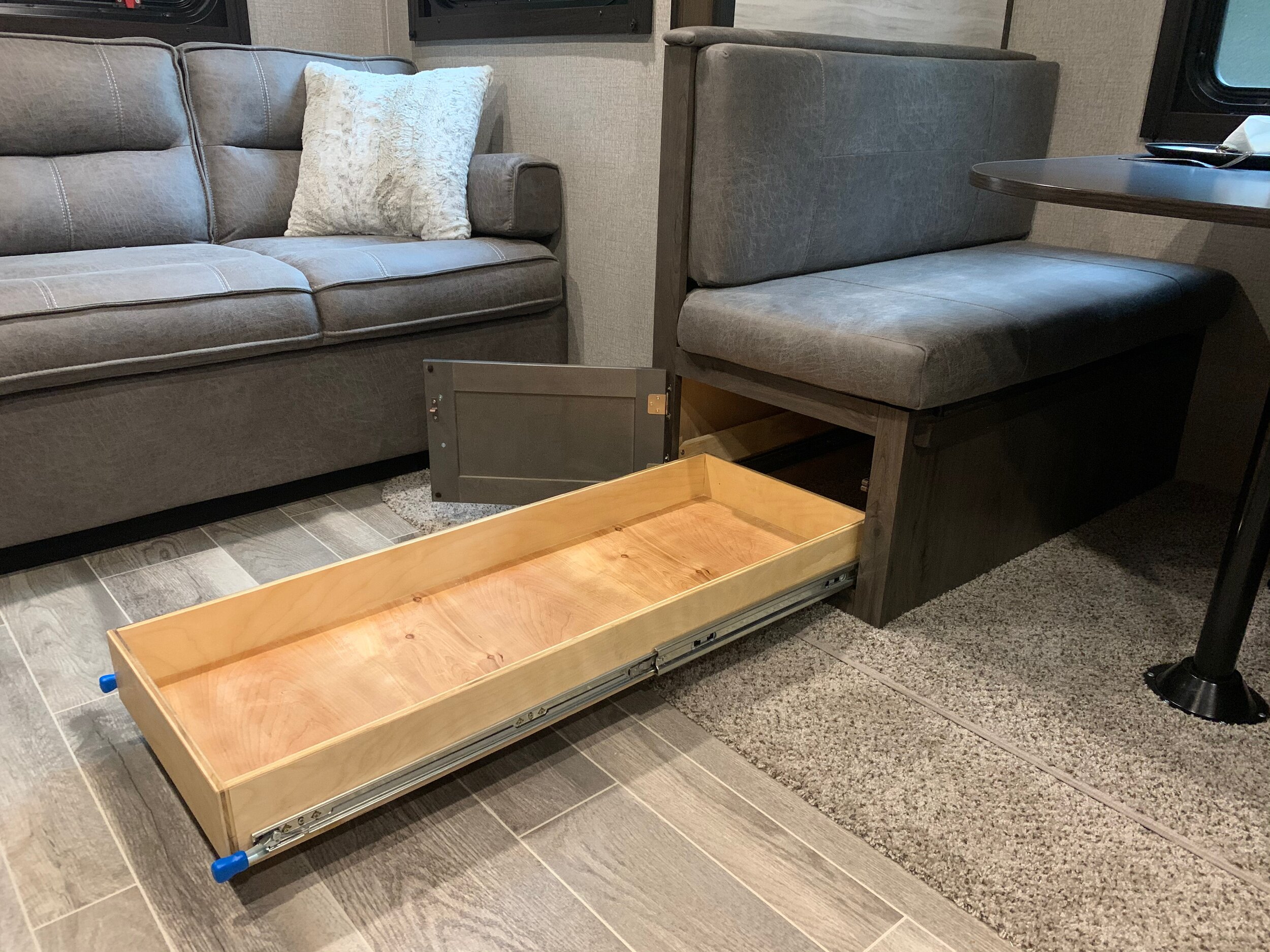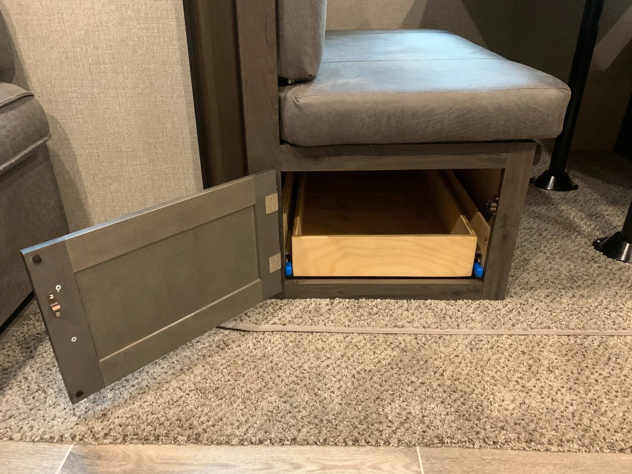 This client had just bought a new Jayco travel trailer and was looking to add a sliding drawer before a cross country trip. I built and installed 2 drawers with 40” locking sliders.